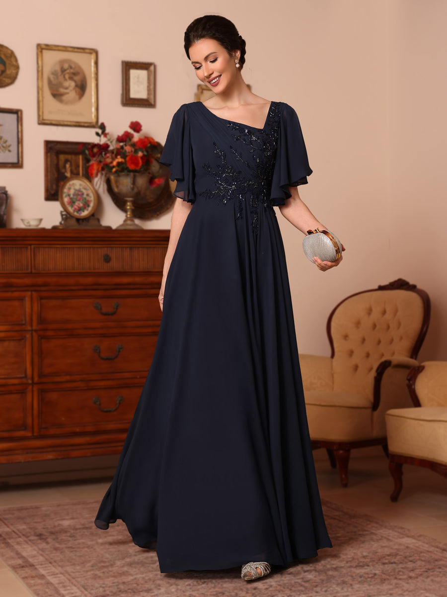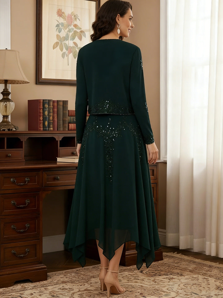 2 Pieces A-Line/Princess V-Neck Chiffon Mother of the Bride Dresses with Jacket Sequins Ankle-Length Long Sleeves
