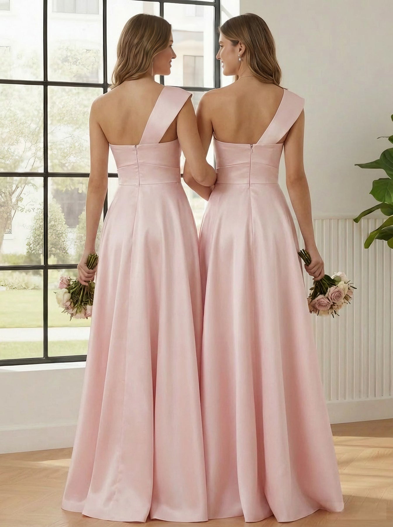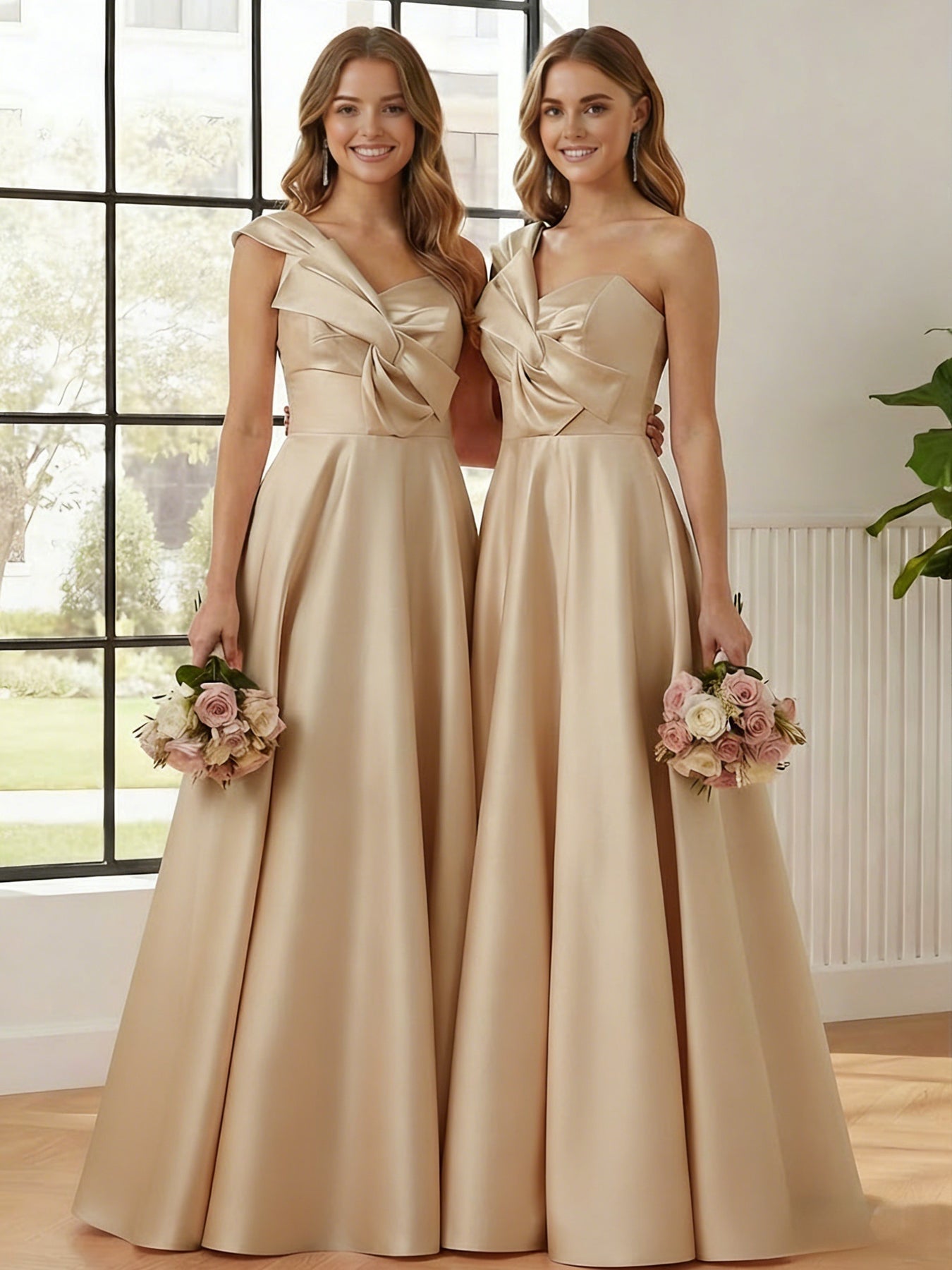MON5412306 MONDRESSY A-Line/Princess One-Shoulder Satin Bridesmaid Dresses Sleeveless Floor-Length Ruched Bowknot
