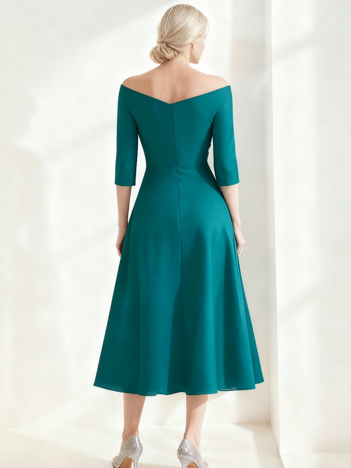 A-Line/Princess Off-the-Shoulder Satin Mother of the Bride Dresses Beading Ruched 3/4 Sleeves Tea-Length Cocktail Dress