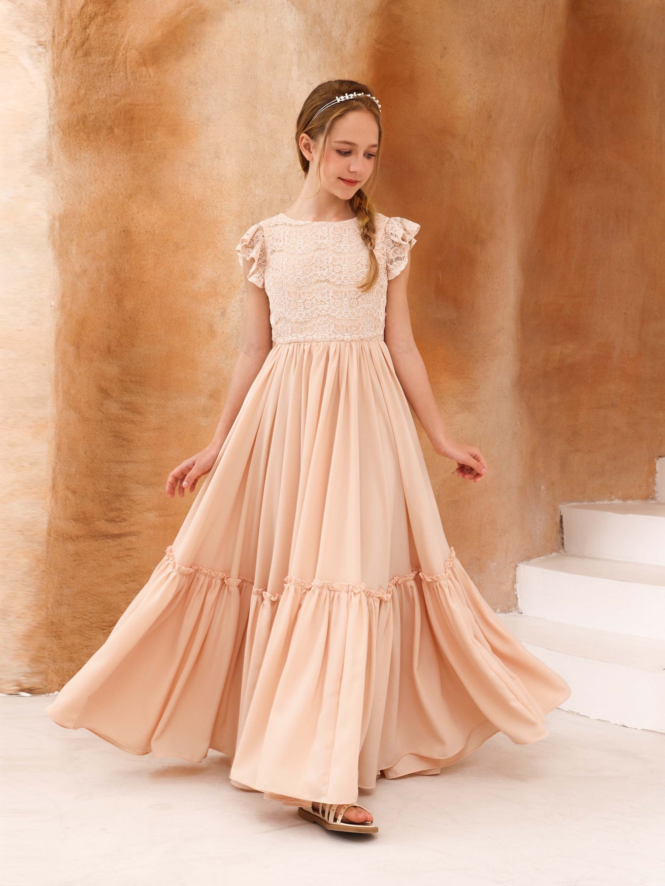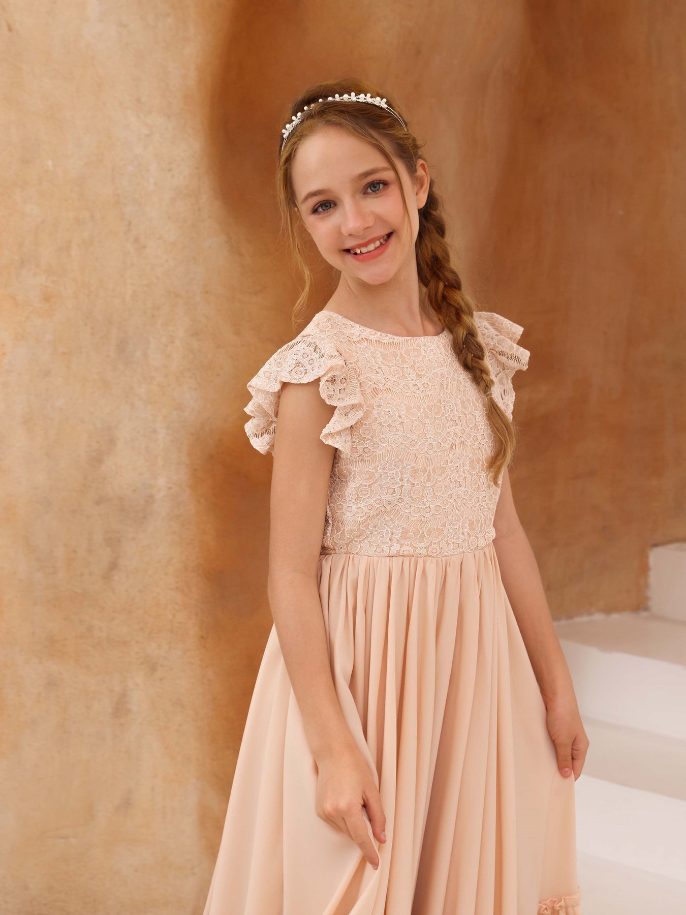 MON11112449 MONDRESSY A-Line/Princess Lace Short Sleeves Scoop Neck Floor-Length Flower Girl Dresses