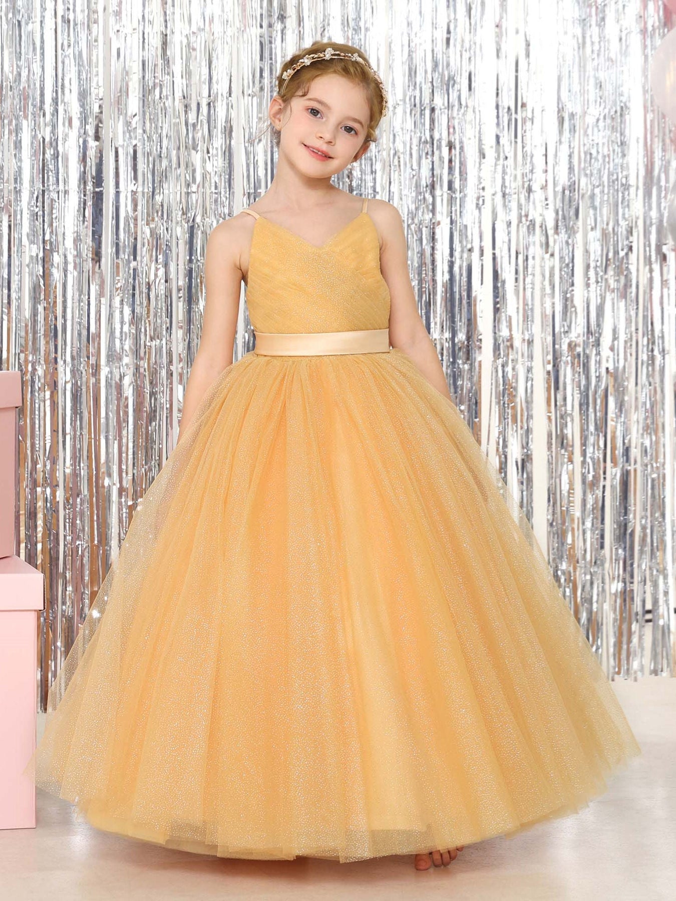 MON11112432 MONDRESSY Ball-Gown Tulle Sleeveless V-Neck Floor-Length Flower Girl Dresses