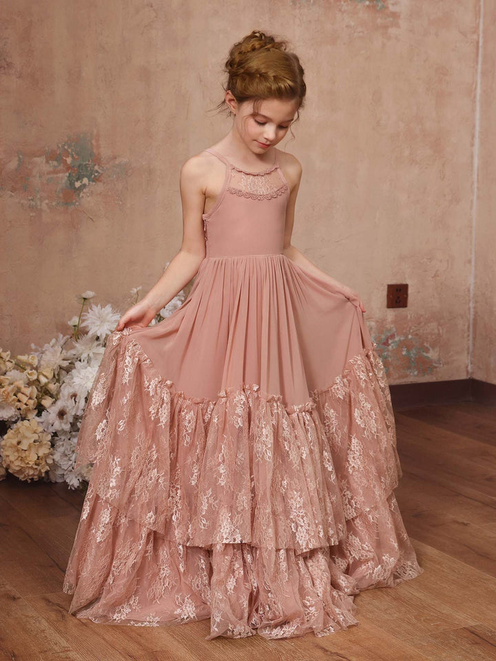 Ball-Gown Round Neck Sleeveless Ankle-Length Flower Girl Dress with Lace