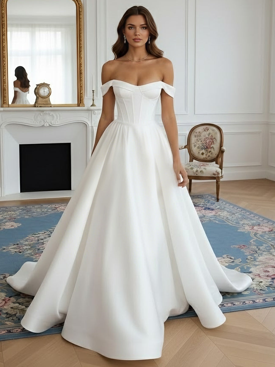 MON141704 MONDRESSY A-Line/Princess Off-the-Shoulder Wedding Dress Satin Floor-Length Sweep Train