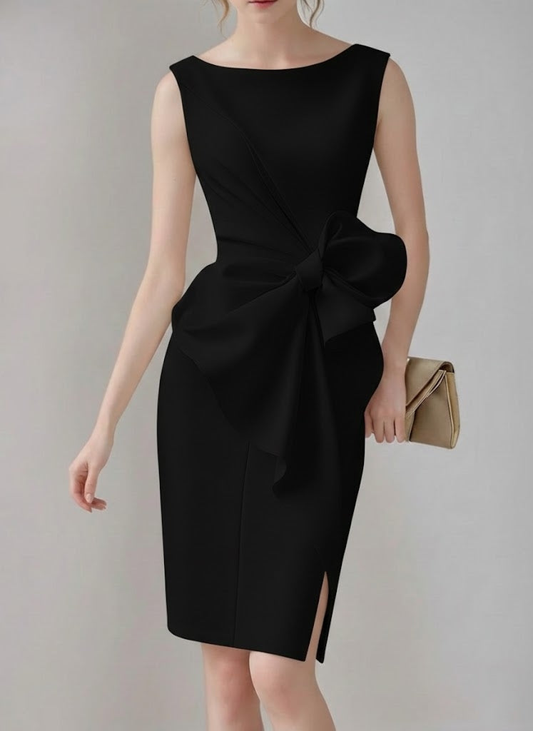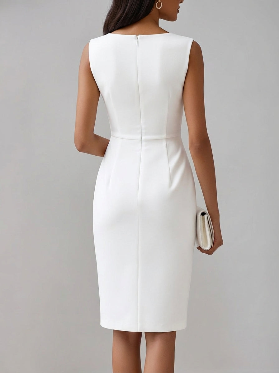 MON141579 MONDRESSY Sheath/Column Crew Neck Sleeveless Knee Length Wedding Dress with Bow & Ruffles