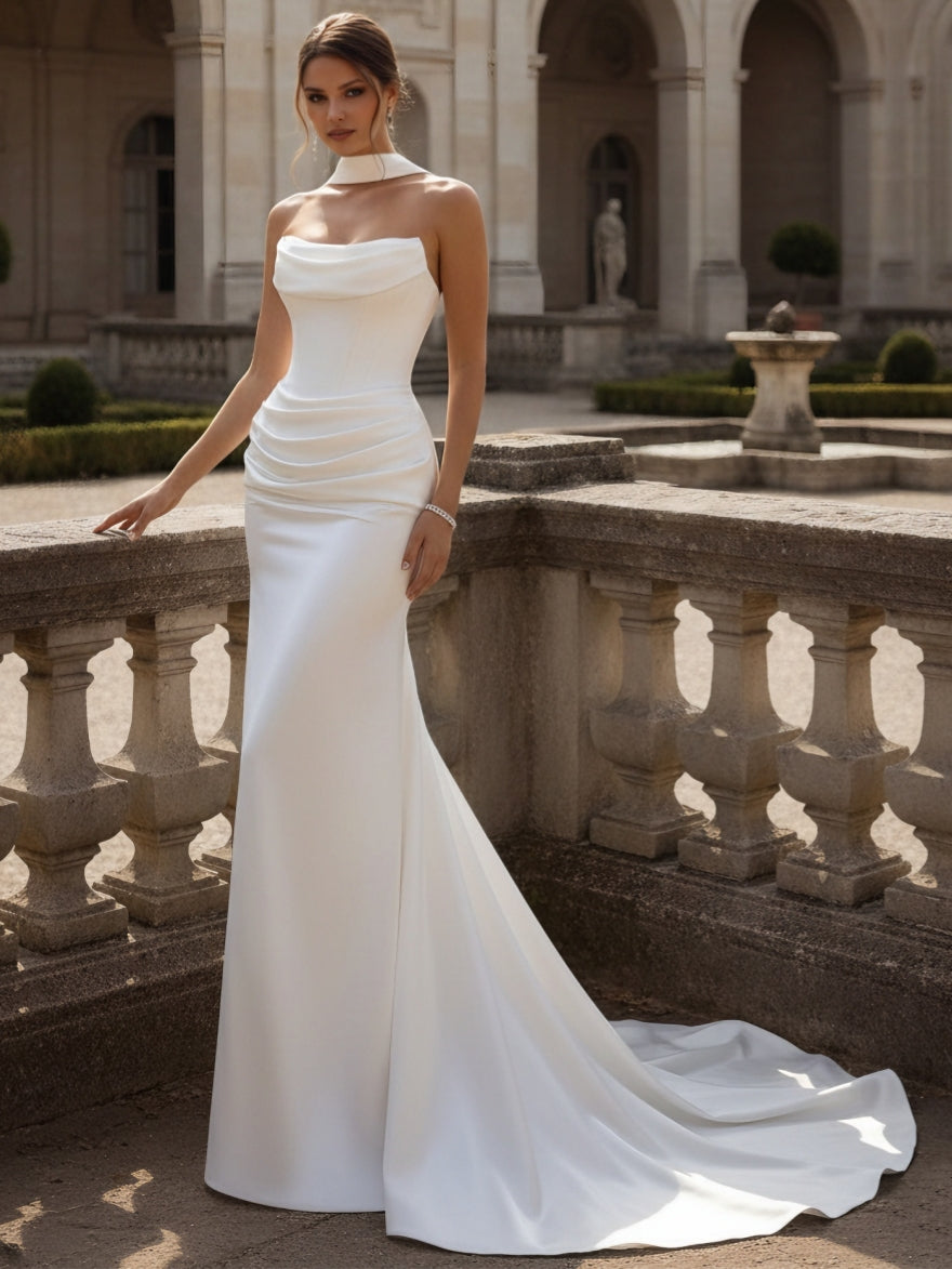 MON141703 MONDRESSY Trumpet/Mermaid Strapless Wedding Dress with Scarf Satin Floor-Length Sweep Train Ruched
