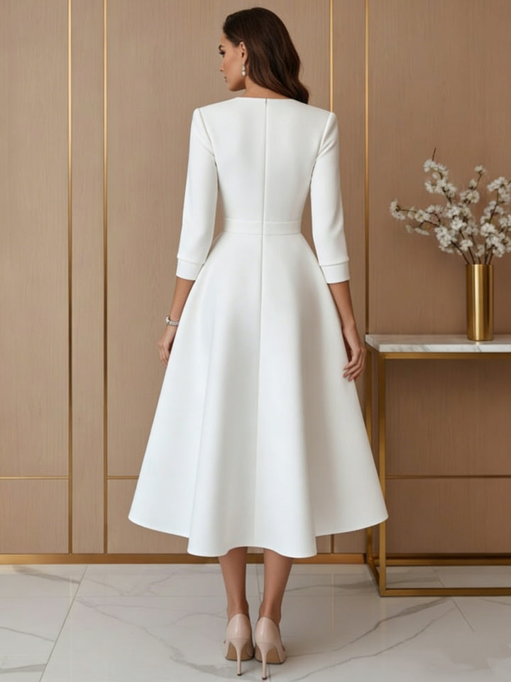 A-Line/Princess V-Neck Satin Wedding Dress Tea-length 3/4 Sleeves