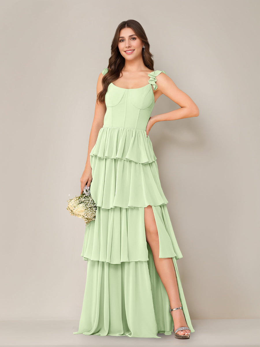 A-Line/Princess Square Neck Sleeveless Floor-Length Chiffon Bridesmaid Dresses with Split Side & Ruffles