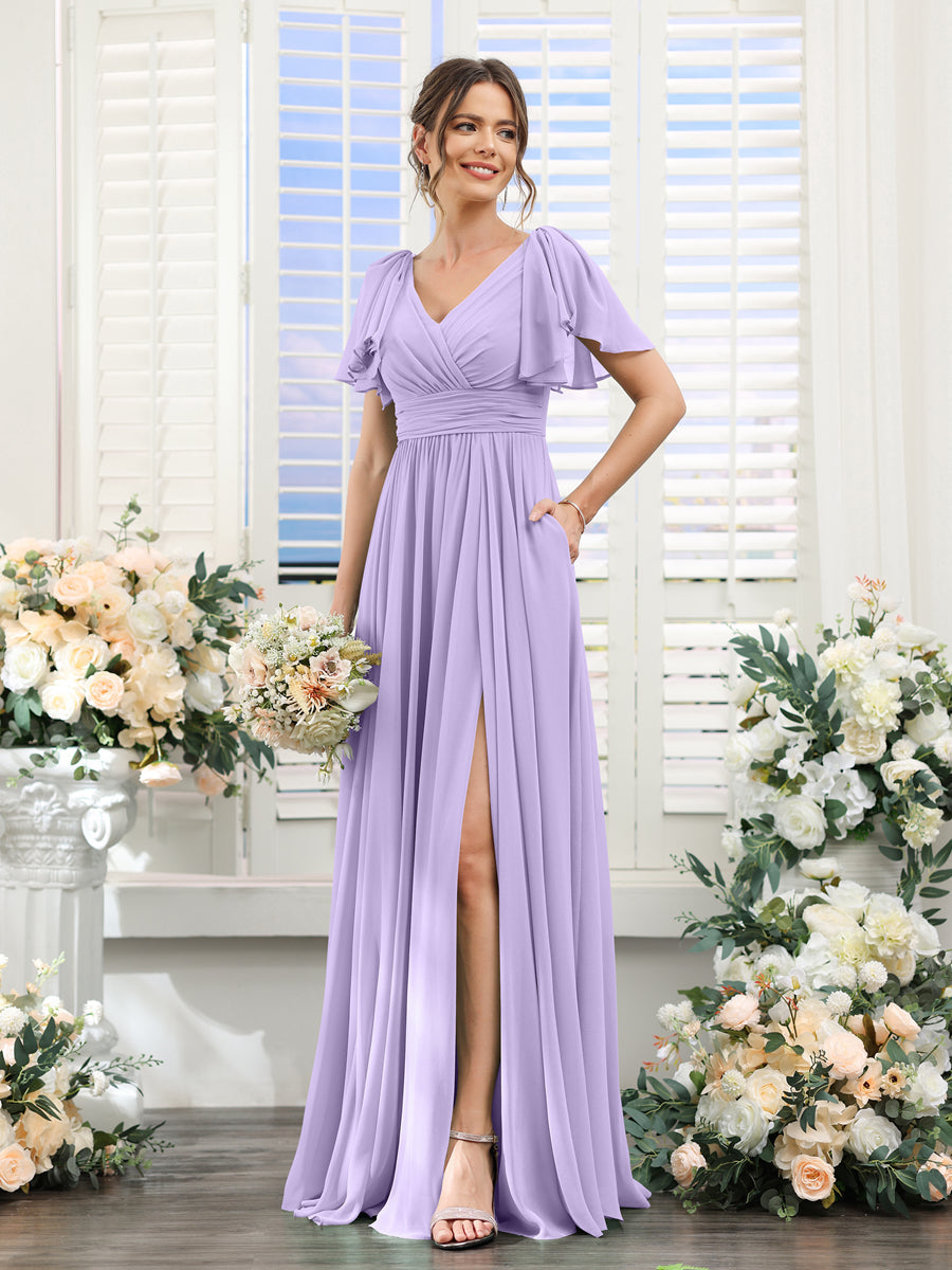 A-Line/Princess V-Neck Short Sleeves Chiffon Bridesmaid Dresses with Split Side & Pockets