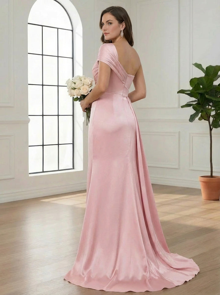 Trumpet/Mermaid One-Shoulder Bridesmaid Dresses with Watteau Train Silk Satin Sleeveless Floor-Length