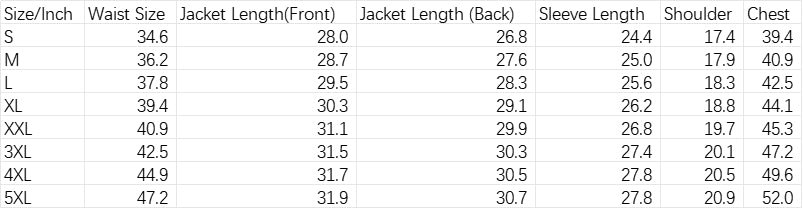 | Size/Inch | Waist Size | Jacket Length(Front) | Jacket Length (Back) | Sleeve Length | Shoulder | Chest |