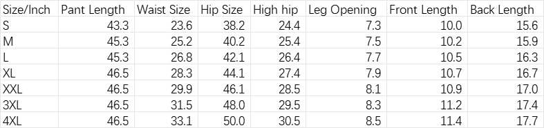 | Size/Inch | Pant Length | Waist Size | Hip Size | High hip | Leg Opening | Front Length | Back Length |