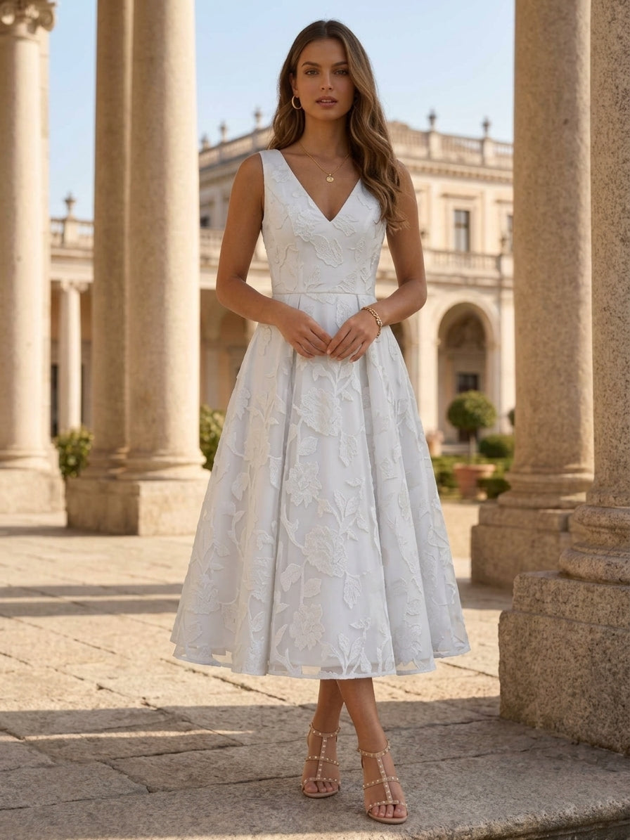 MON8040491 MONDRESSY A-Line/Princess V-Neck Lace Floral Cocktail Dresses Tea-Length Sleeveless Formal Dresses