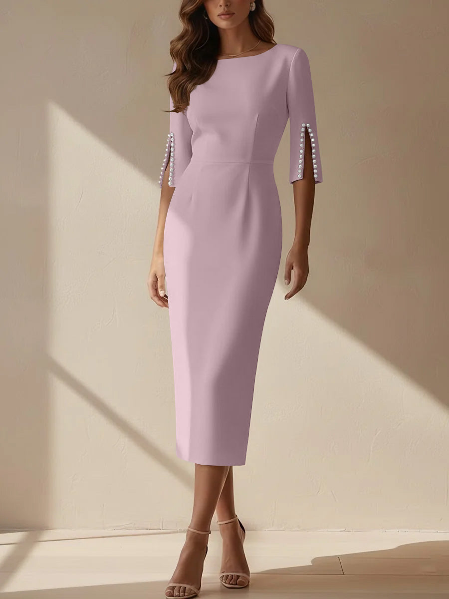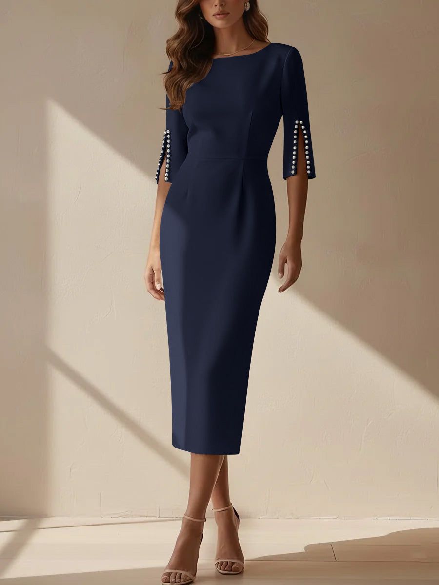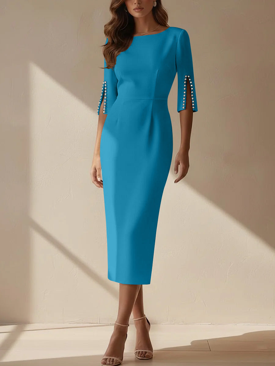MON8040391 MONDRESSY Sheath/Column Scoop Stretch Satin Cocktail Dresses Tea-Length Half Sleeves Formal Dress