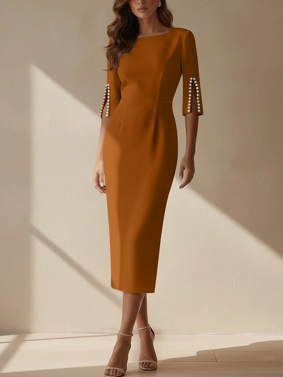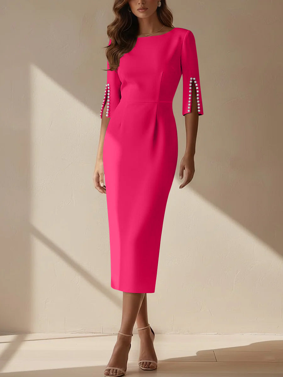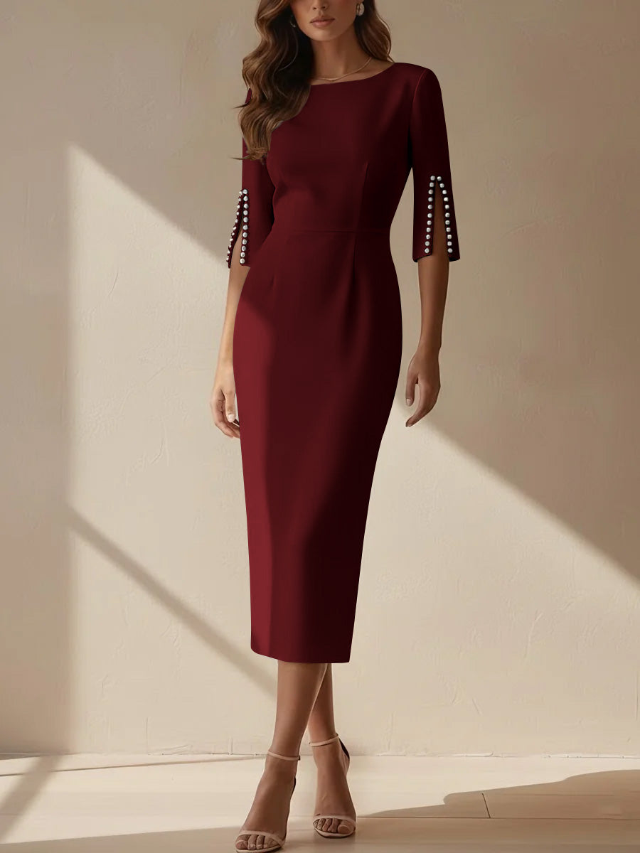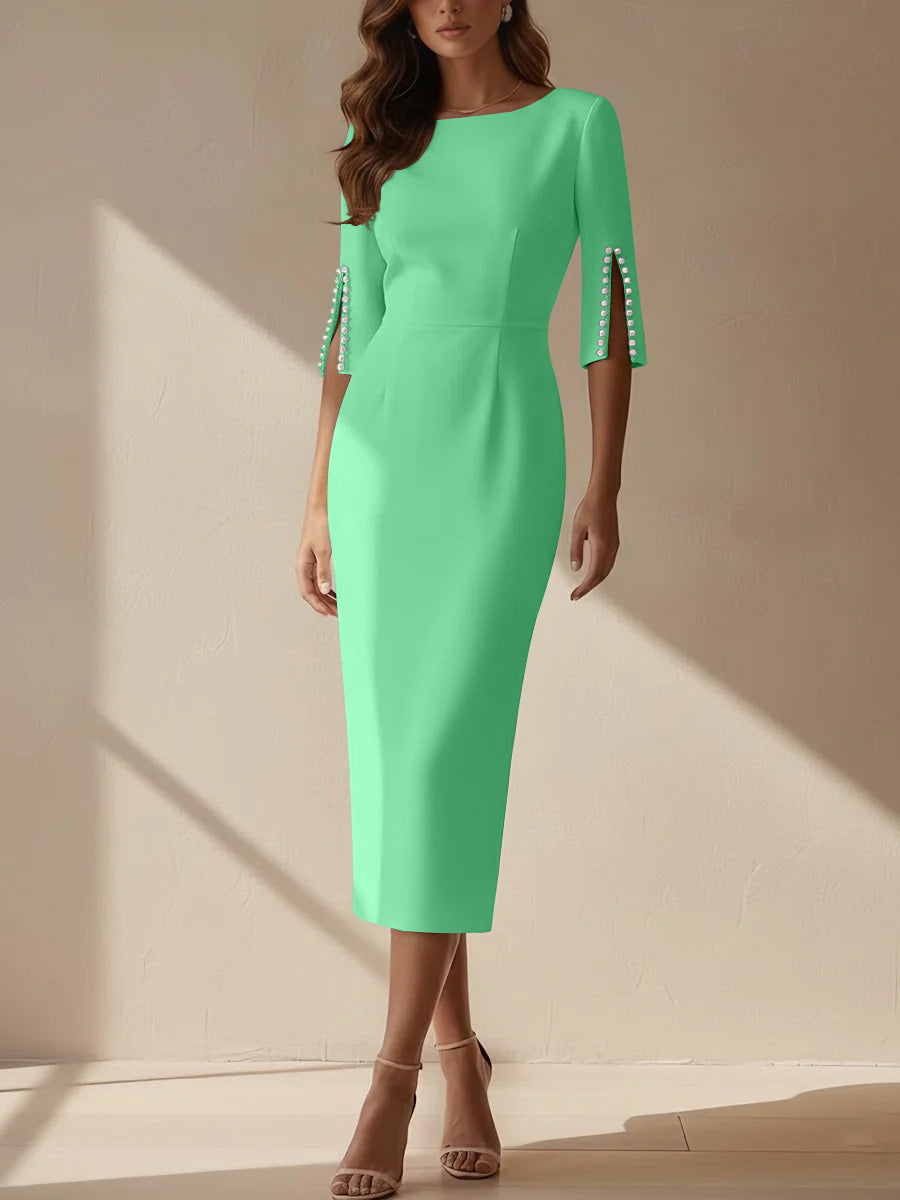 MON8040391 MONDRESSY Sheath/Column Scoop Stretch Satin Cocktail Dresses Tea-Length Half Sleeves Formal Dress