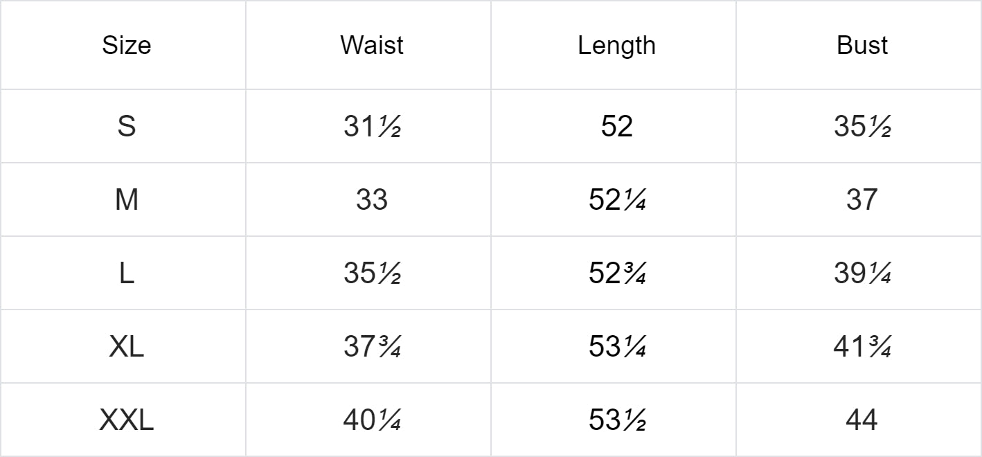 | Size | Waist | Length | Bust |