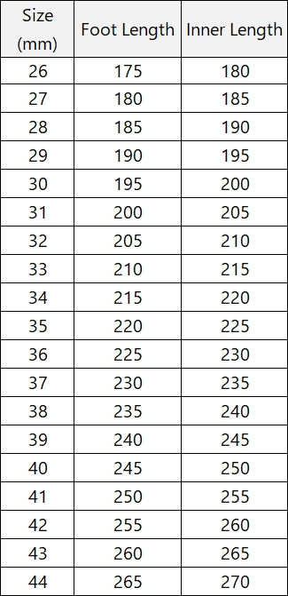 | Size(mm) | Foot Length | Inner Length |