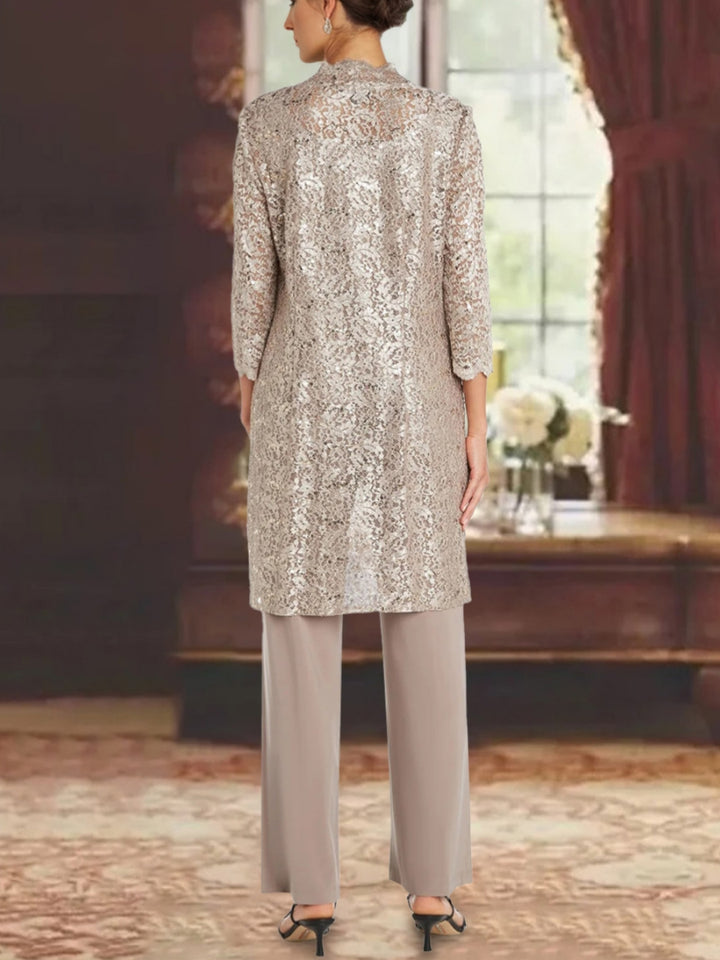 2 Pieces Scoop 3/4 Sleeves Floor-Length Mother of the Bride Pantsuits with Lace Appliques