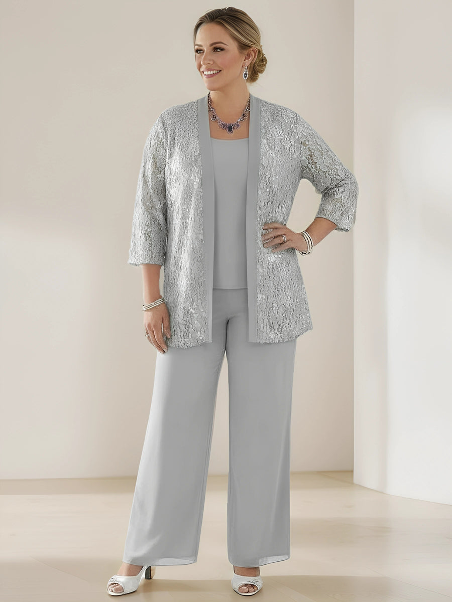 3 Pieces Scoop Neck 3/4 Sleeves Plus Size Mother of the Bride Pantsuits with Lace & Sequins & Jacket Ankle-Length