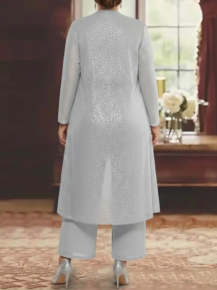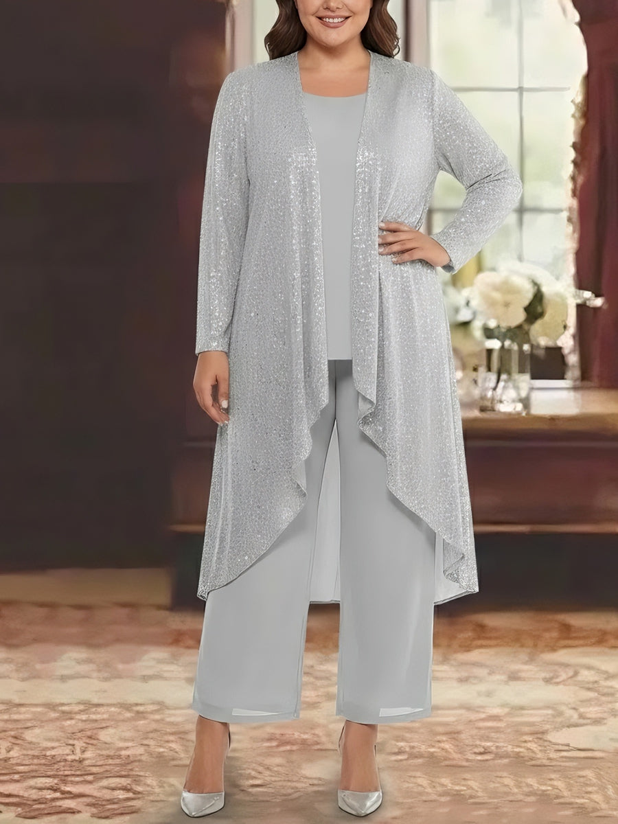 3 Pieces Chiffon Sequins Scoop Plus Size Mother of the Bride Pantsuits with Jacket Long Sleeves Ankle-Length