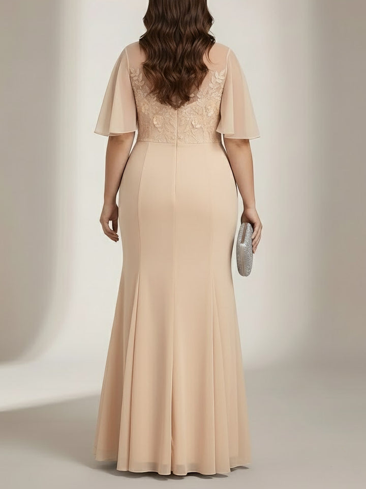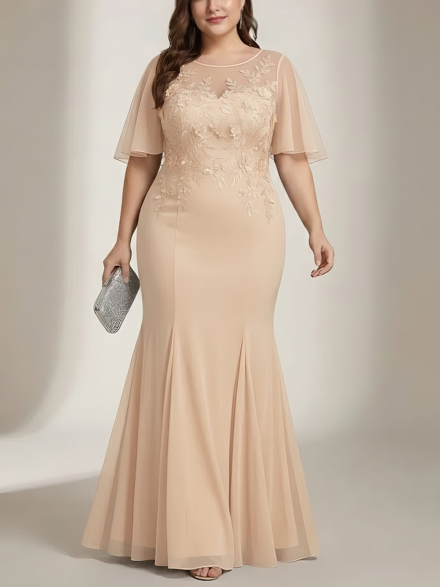 Trumpet/Mermaid Scoop Chiffon Plus Size Mother of the Bride Dresses Lace Floor-Length Short Sleeves