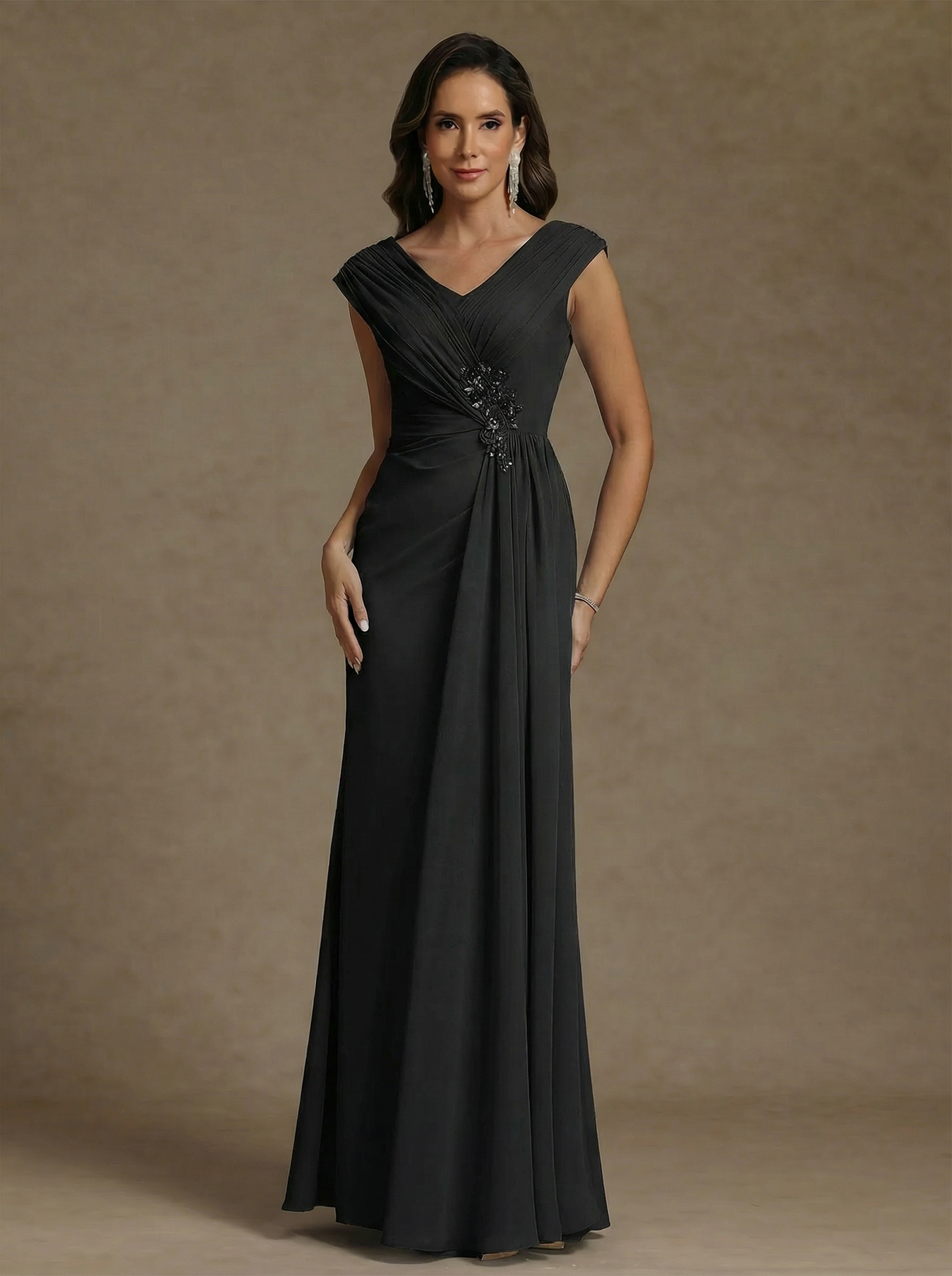 MON2312679 MONDRESSY Sheath/Column V-Neck Chiffon Mother of the Bride Dressese Floor-Length Ruched Sleeveless Appliques