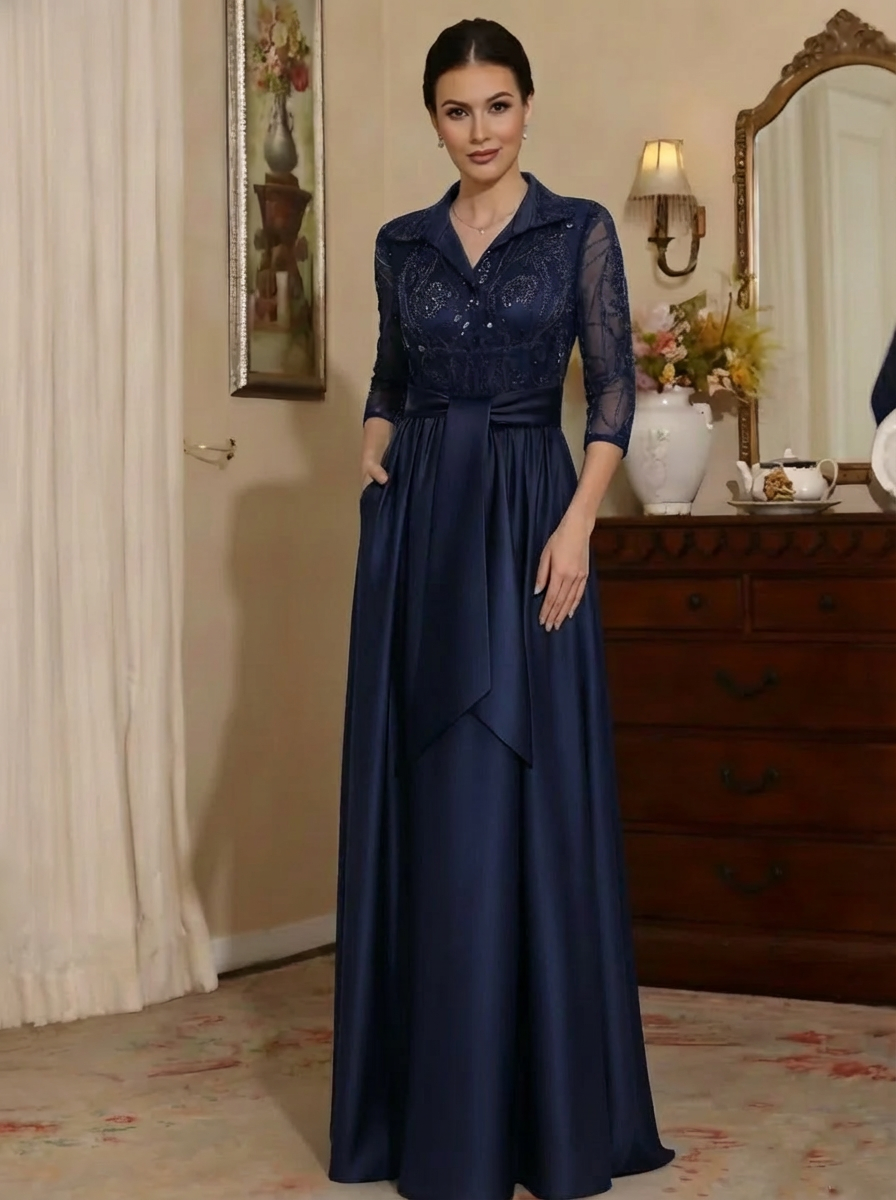 MON2312689 MONDRESSY Sheath/Column V-Neck Satin Mother of the Bride Dresses 3/4 Sleeves With Pockets Floor-Length Lace Sequins