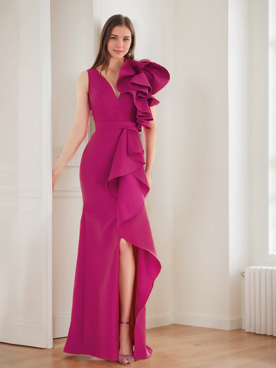 Trumpet/Mermaid V-Neck Sleeveless Ruffled Evening Dresses with Split Side & Belt