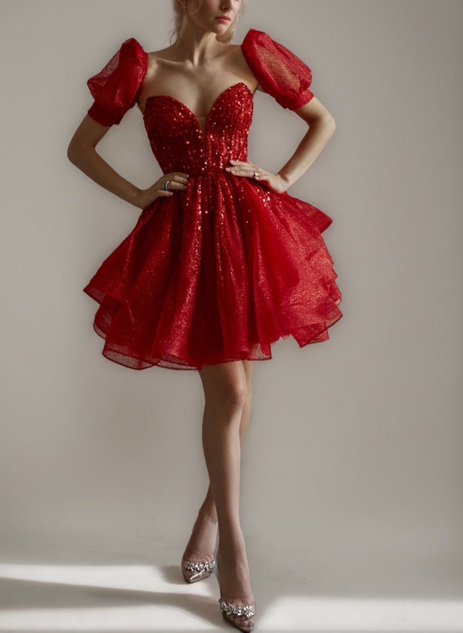 A-Line/Princess Off-the-Shoulder Sweetheart Sleeveless Short/Mini Party Dance Cocktail Homecoming Dresses With Ruffles & Sequins