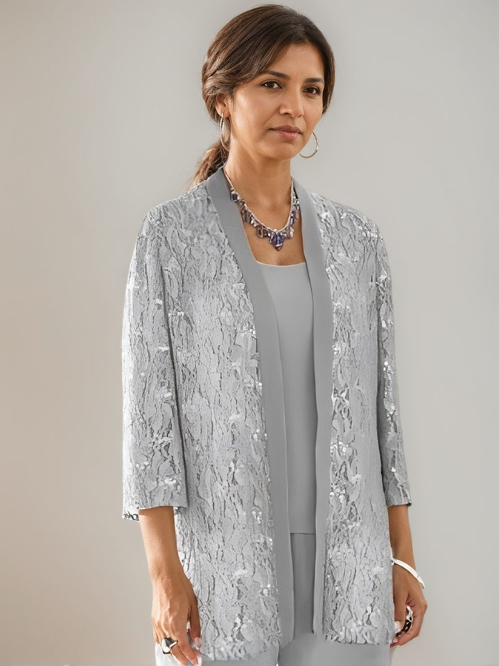 3 Pieces Scoop Neck 3/4 Sleeves Ankle-Length Mother of the Bride Pantsuits with Lace & Sequins & Jacket
