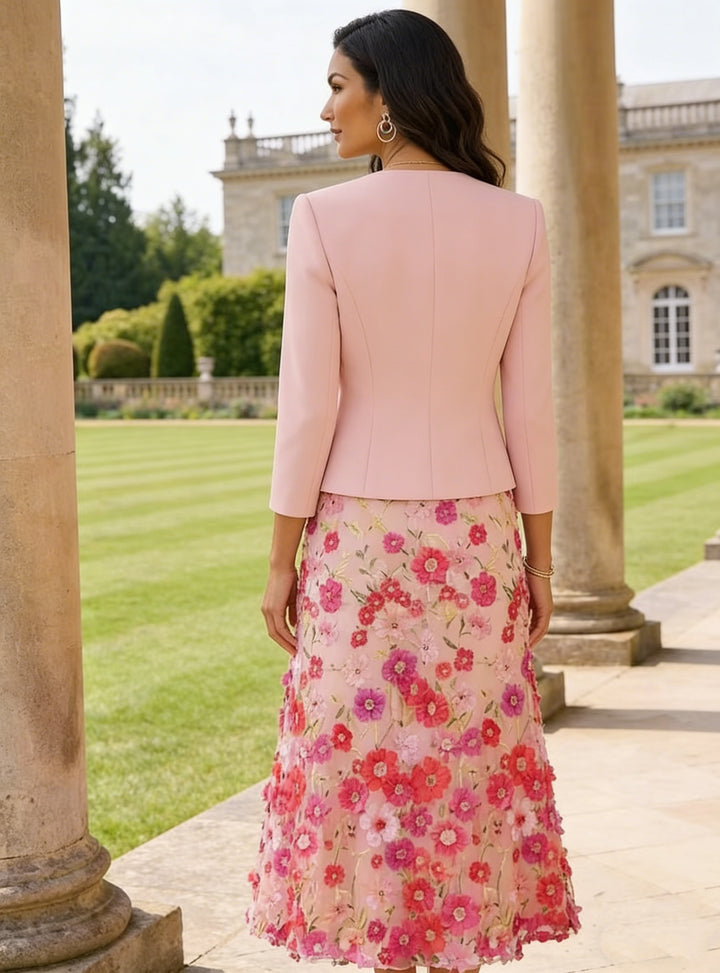 A-Line/Princess Scoop Stretch Satin Mother of the Bride Dresses with Jacket Lace Embroidery Floral Tea-Length 3/4 Sleeves