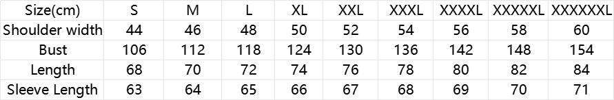 | Size(cm) | S | M | L | XL | XXL | XXXL | XXXXL | XXXXXL | XXXXXXL |