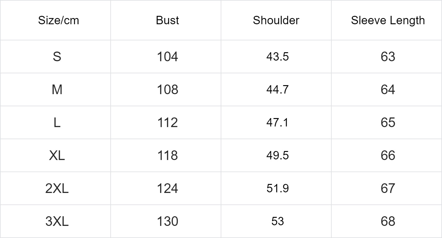 | Size/cm | Bust | Shoulder | Sleeve Length |