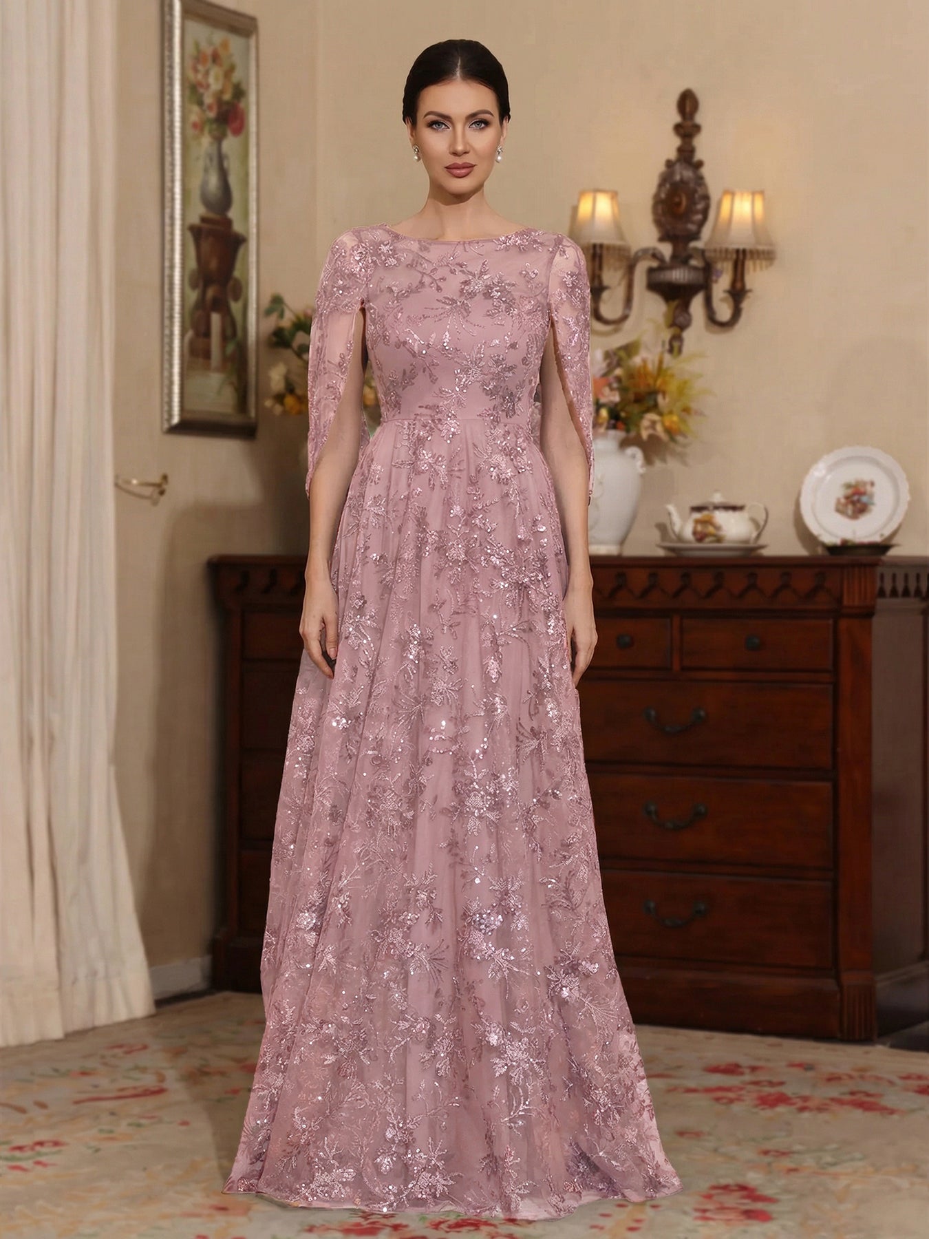 A-Line/Princess Scoop Sequins Lace Mother of the Bride Dresses Cape Sleeves Floral Floor-Length