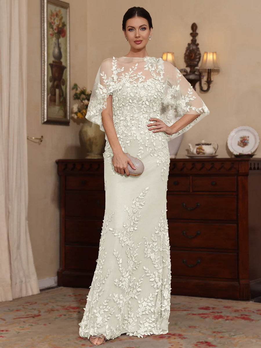 2 Pieces Sheath/Column Scoop Lace Mother of the Bride Dresses with Wrap Beading Half Sleeves Floor-Length