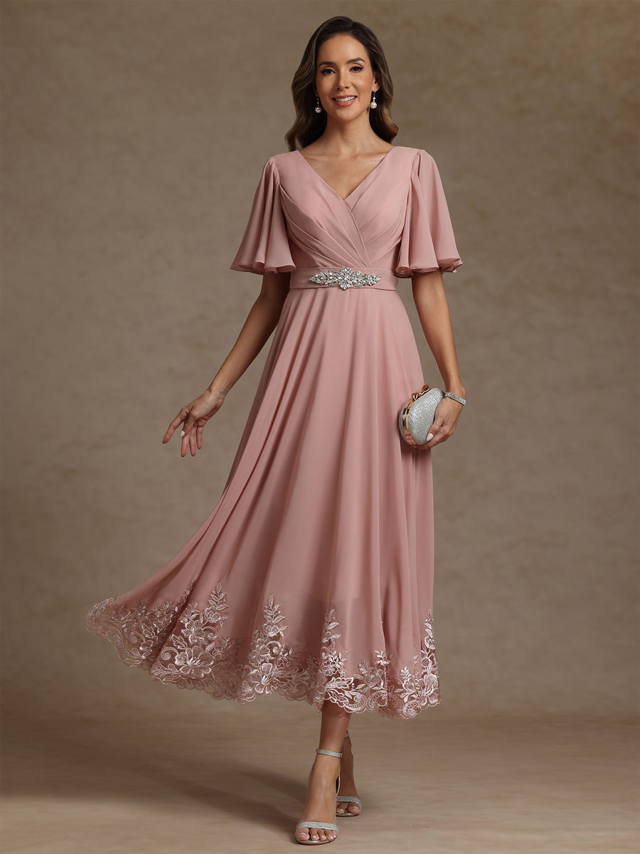 A-Line/Princess V Neck Mother of the Bride Dresses Short Sleeves Chiffon Lace Tea Length with Sash