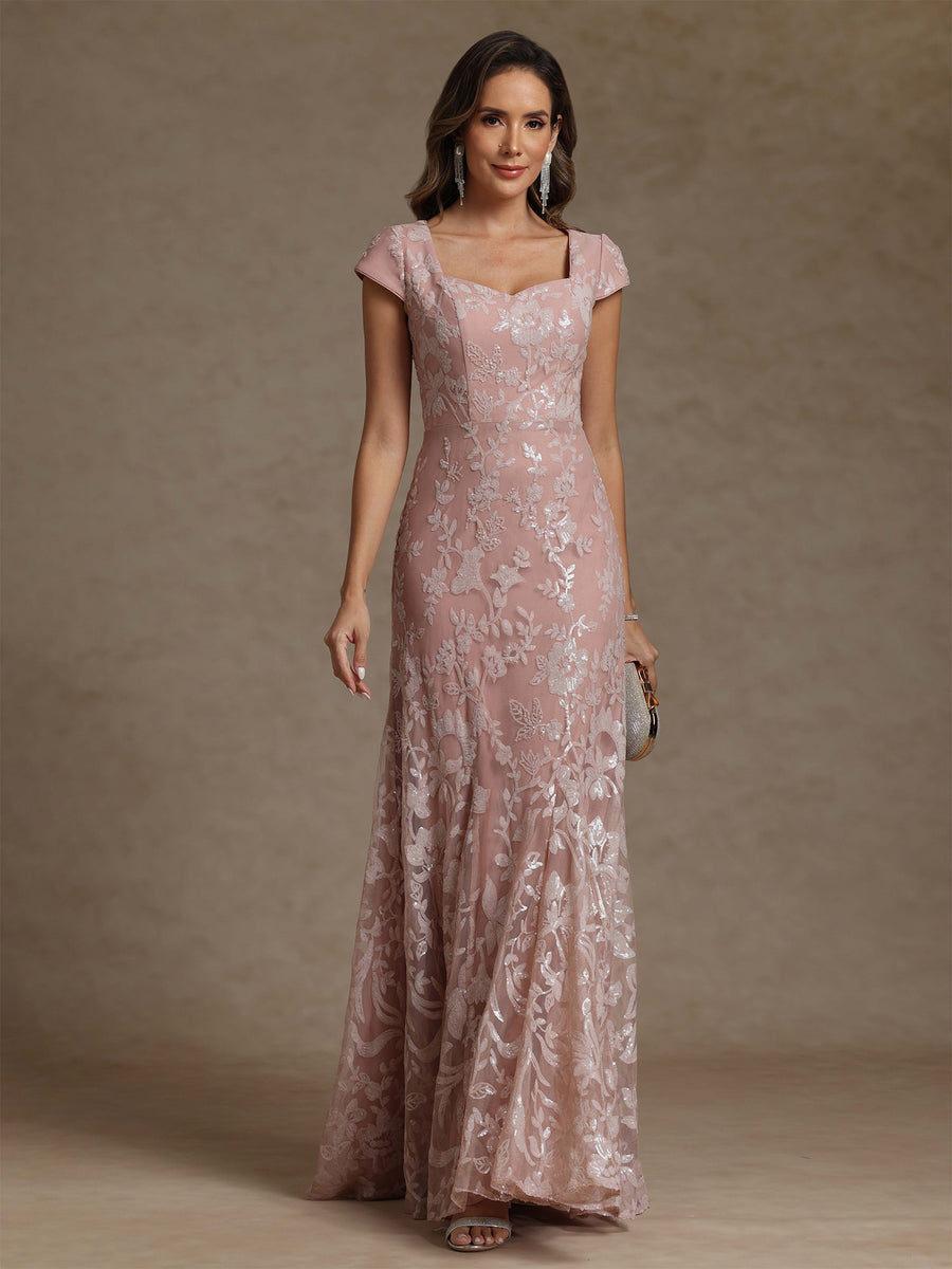 Sheath/Column Square Collar Chiffon Mother of the Bride Dresses Floor-Length Lace Sequins Short Sleeves