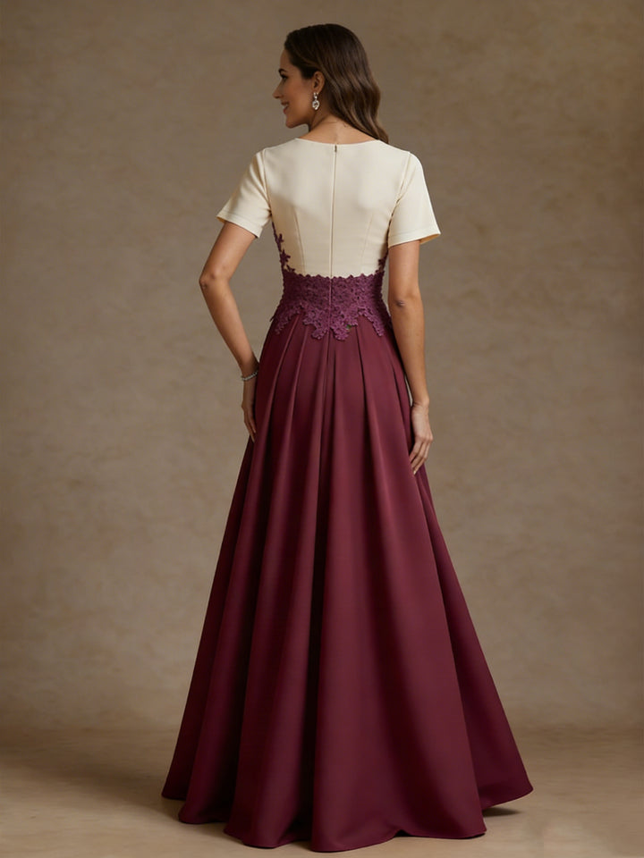 A-Line/Princess V-Neck Stretch Satin Mother of the Bride Dresses with Split Side Lace Floor-Length Short Sleeves