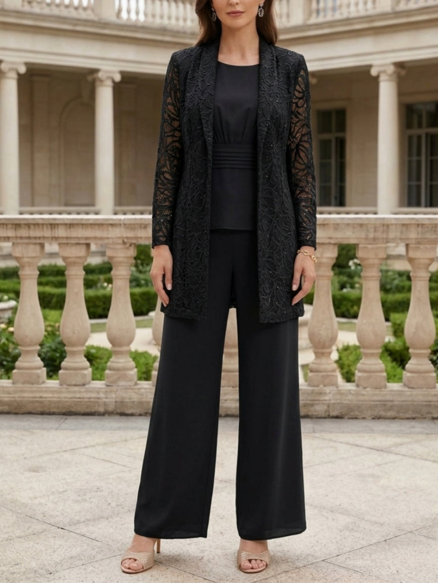 MON2312917 MONDRESSY 3 Pieces Suit Scoop Chiffon Mother of the Bride Pantsuits with Jacket Long Sleeves Ankle-Length Lace