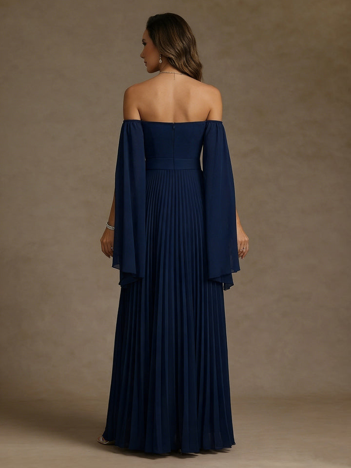 A floor-length navy gown creates a polished and graceful silhouette. Long styles are ideal for formal weddings and black-tie dress codes, offering timeless elegance in photographs.