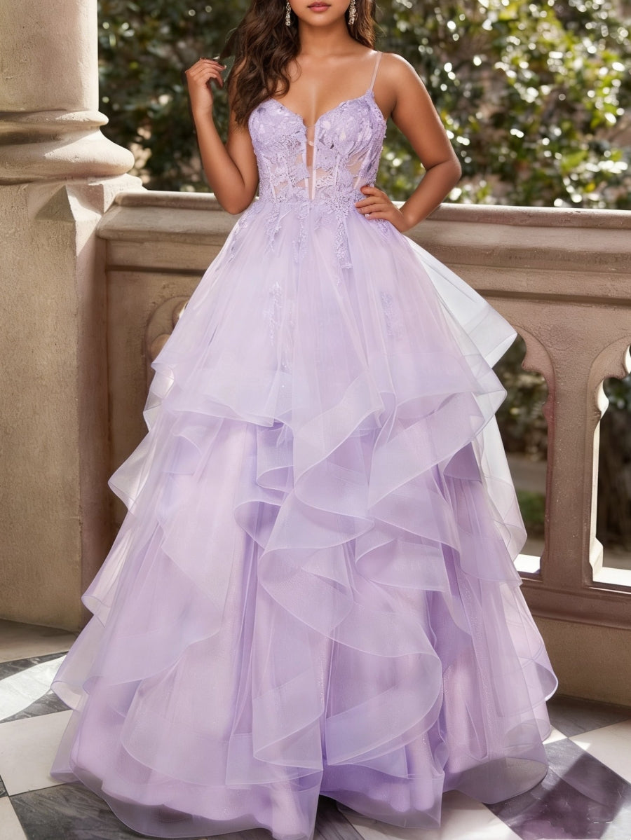 MON342843 MONDRESSY A-Line/Princess Sweetheart Tulle Prom Dresses Floor-Length Ruffles Formal Dresses Lace Spaghetti Straps