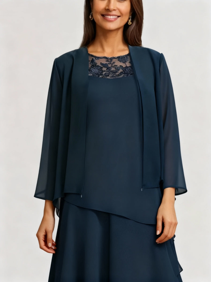 Chiffon Scoop 3/4 Sleeves Mother of the Bride Pantsuits with Lace Jacket Ankle-Length