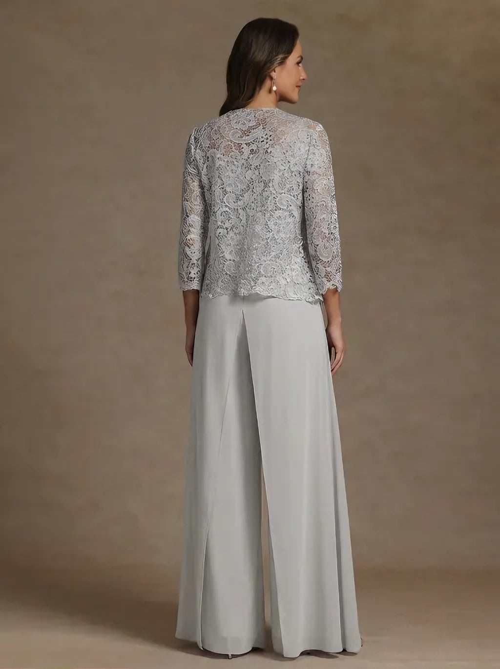MON2312780 MONDRESSY 3 Pieces Square Collar Chiffon Mother of the Bride Pantsuits with Jacket Lace Ankle-Length with Overskirt Long Sleeves