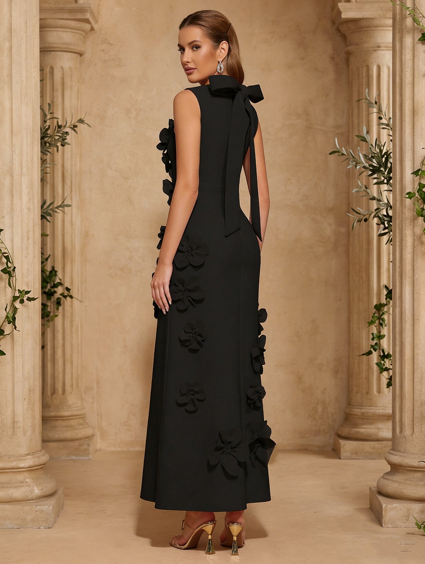 MON8040473W MONDRESSY A-Line/Princess High Neck Stretch Satin Cocktail Dresses with 3D Flower Sleeveless Ankle-Length Formal Dresses
