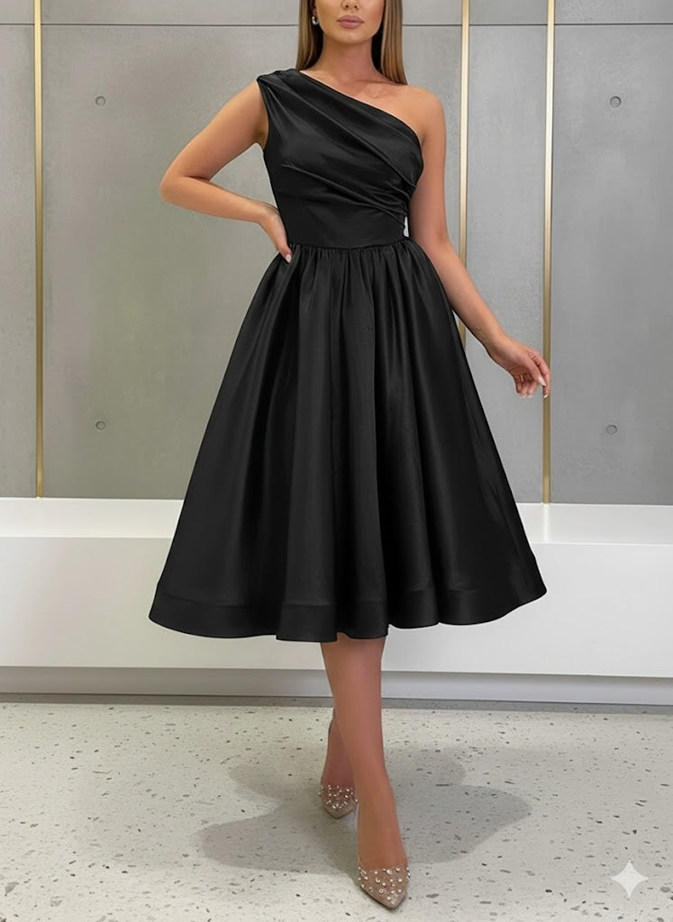 MON8040397 MONDRESSY A-Line/Princess One-Shoulder Silk Satin Cocktail Dresses Sleeveless Tea-Length Pleated Formal Dresses