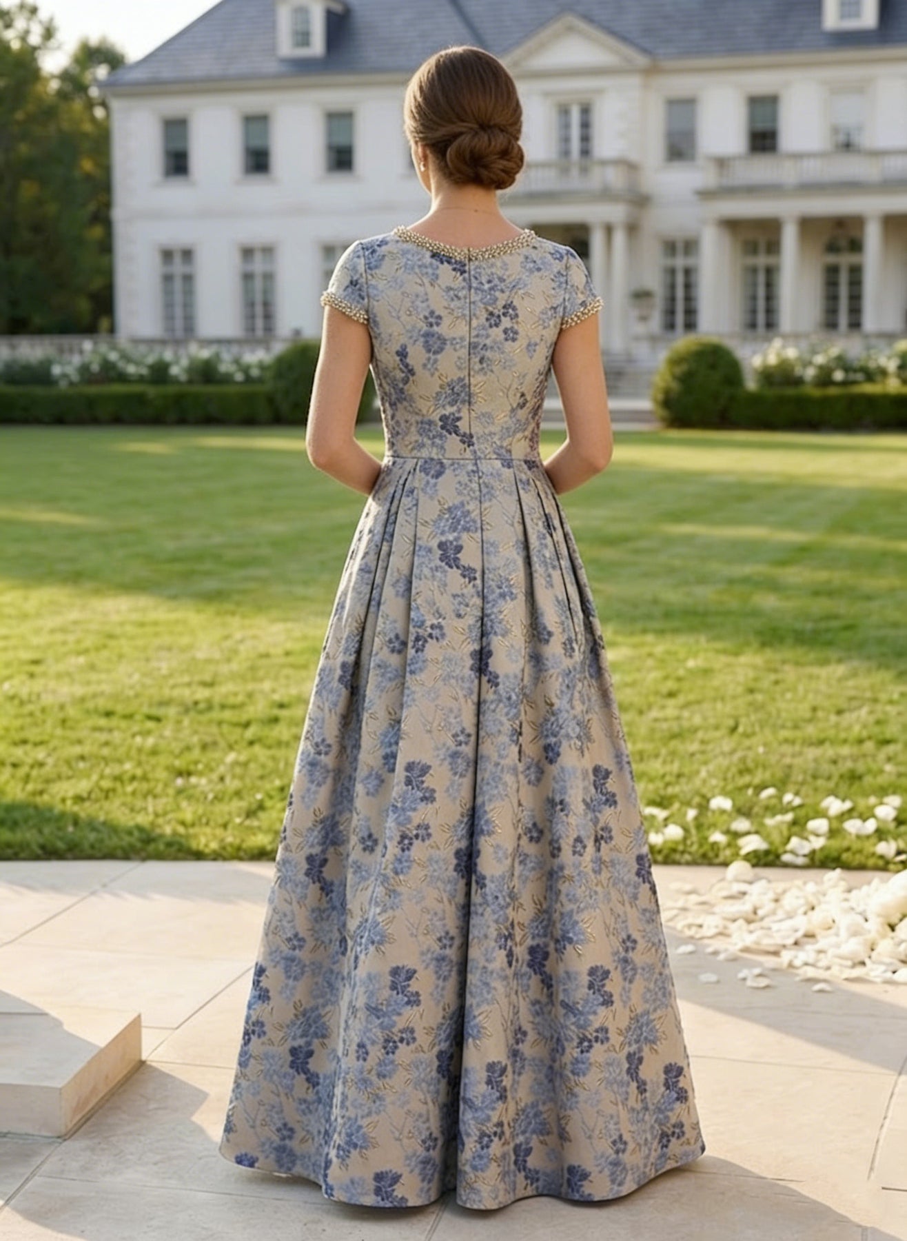 MON2312897 MONDRESSY A-Line/Princess Scoop Jacquard Mother of the Bride Dresses Floral Short Sleeves Floor Length Beading