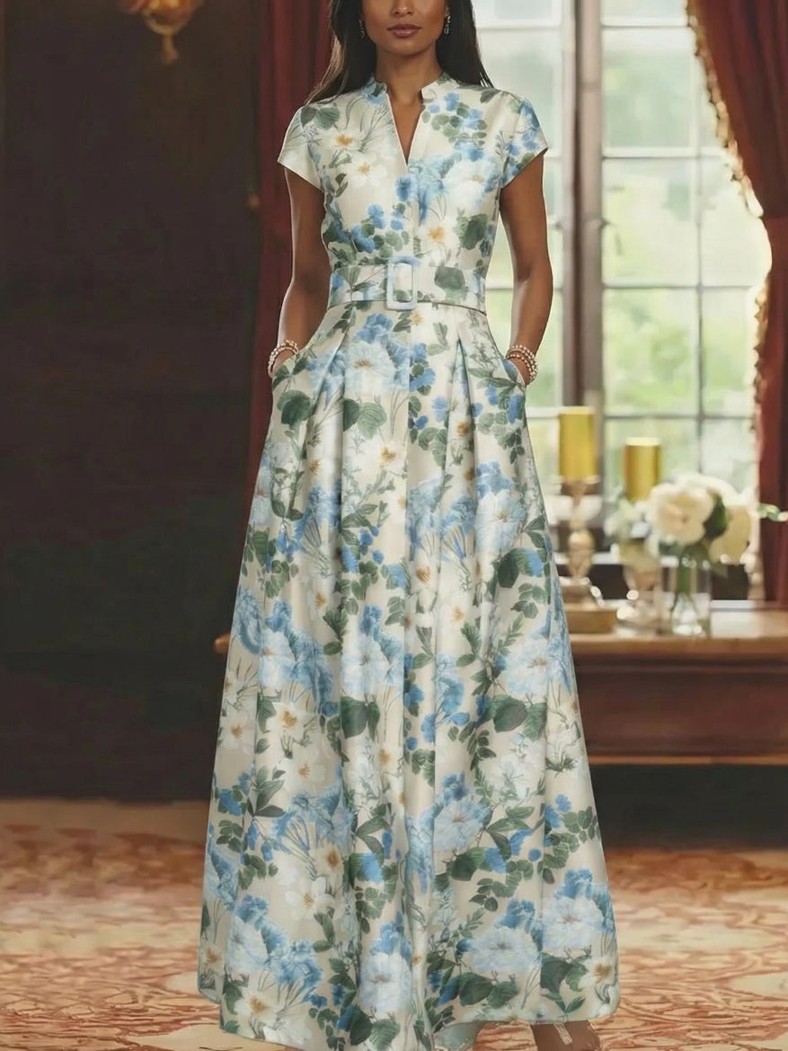 A-Line/Princess V-Neck Mother of the Bride Dresses Printed Satin Short Sleeves Floral Floor-Length