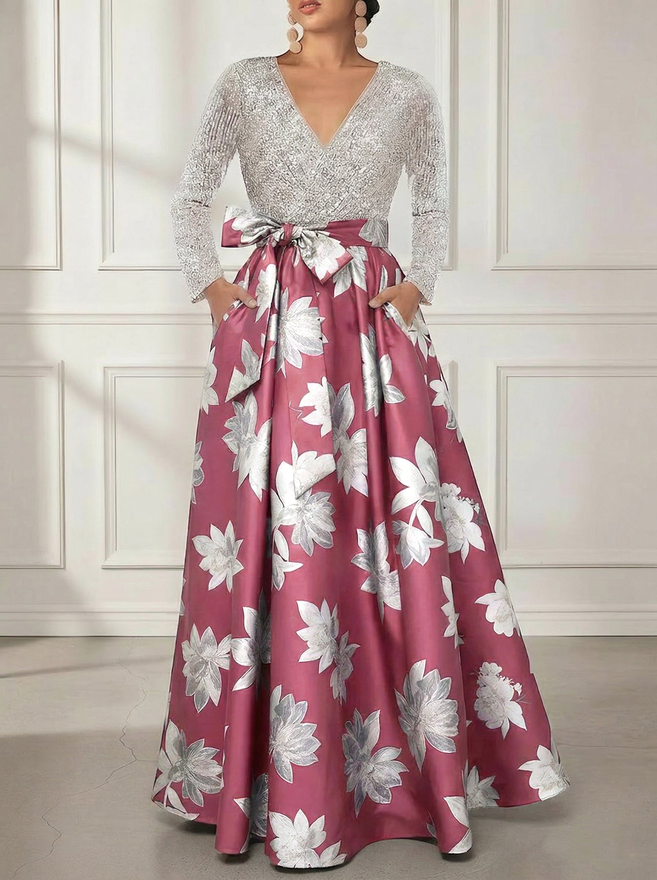 MON2312767 MONDRESSY A-Line/Princess V-Neck Printed Satin Mother of the Bride Dresses Sequins Long Sleeves Floral Floor-Length Bowknot