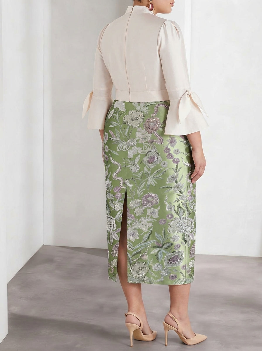MON2312585P MONDRESSY Sheath/Column V-Neck Satin Plus Size Mother of the Bride Dresses 3/4 Sleeves Shirt Collar Tea-Length Cocktail Dresses
