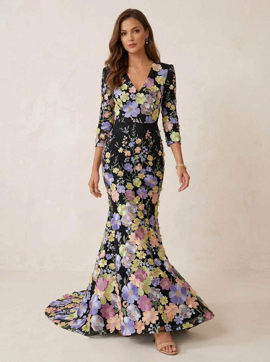 Trumpet/Mermaid V-Neck Lace Evening Dresses Floral Embroidery Floor-Length 3/4 Sleeves Party Dresses