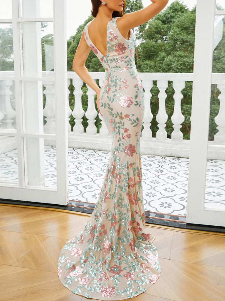 Trumpet/Mermaid V-Neck Prom Dresses Floral Sequins Floor-Length Sleeveless Sweep Train Formal Dresses